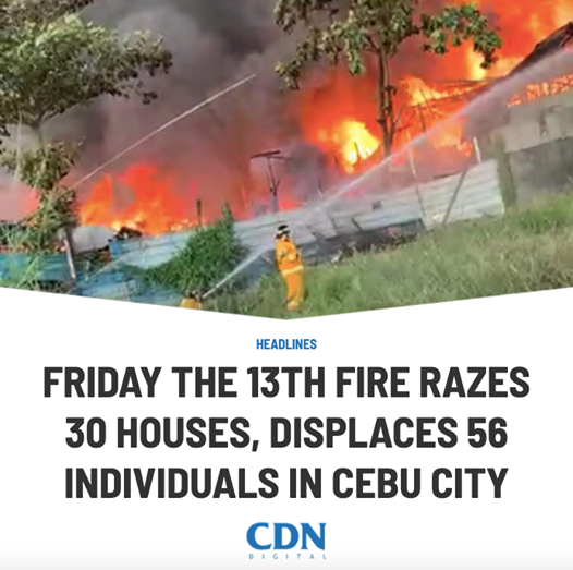 フィリピン、セブ市—今週の金曜日、セブ市のバランガイパヒナセントラルにあるシティオファティマで、火災により少なくとも30戸の家屋が焼失し、56人が避難しました。